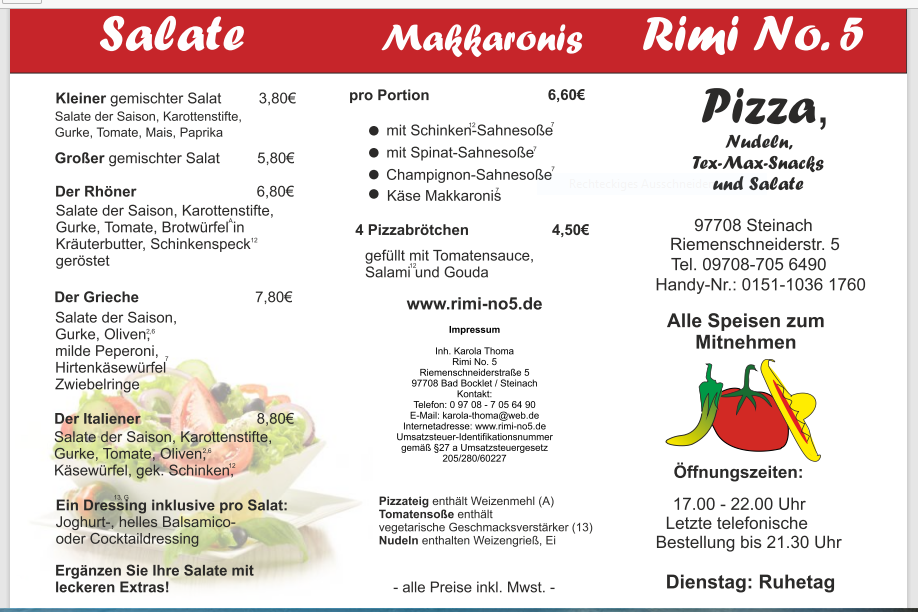 Bestellhotline: 0 97 08 - 7 05 64 90 Mobil: 01511 0361760 täglich von 17.00 Uhr bis 21.30 Uhr Dienstag: Ruhetag